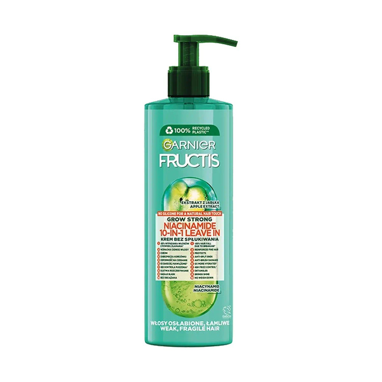 کرم مو ده کاره نیاسینامید گارنیه در حجم 400 میل مانند دیگر مدلهای کرم مو گارنیر، ده ویژگی و خاصیت برای موهای آسیب دیده و خشک دارد. مشکلاتی مانند خشکی، ریزش مو، موخوره، وزی و غیره که همگی از آسیب مو سرچشمه میگیرند را این محصول درمان میکند. عصاره سیب، گلیسیرین گیاهی و نیاسین از ترکیبات تشکیل دهنده این محصول هستند. عصاره سیب خاصیت ضد ریزش دارد و خون رسانی را بهبود میبخشد. گلیسیرن هم خاصیت رطوبت رسانی داشته و رطوبت مورد نیاز مو را تامین میکند. نیاسین نیز علاوه بر خواص ذکر شده برای دو ترکیب بالا، رشد موها را تقویت نموده و ضخامت مو را نیز افزایش میدهد. خواص ده گانه کرم مو گارنیر نیاسینامید شامل موارد زیر میگردد: